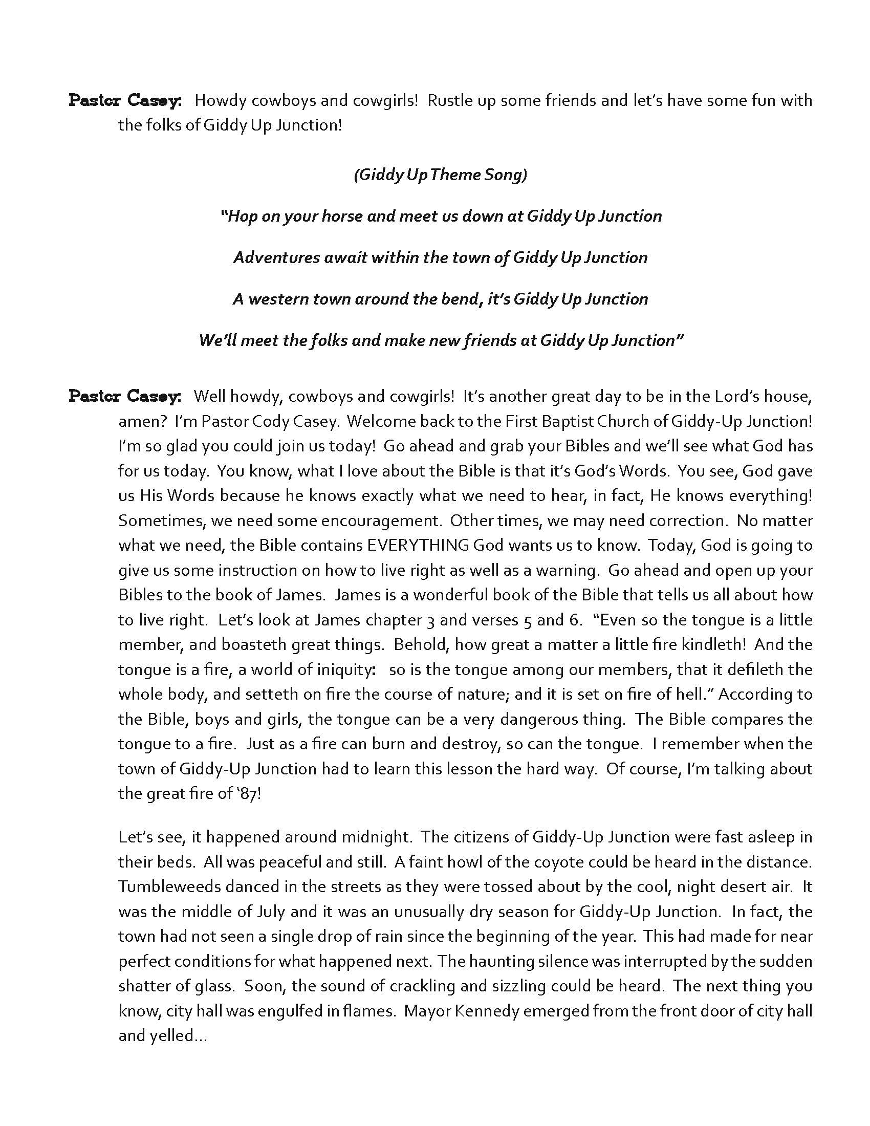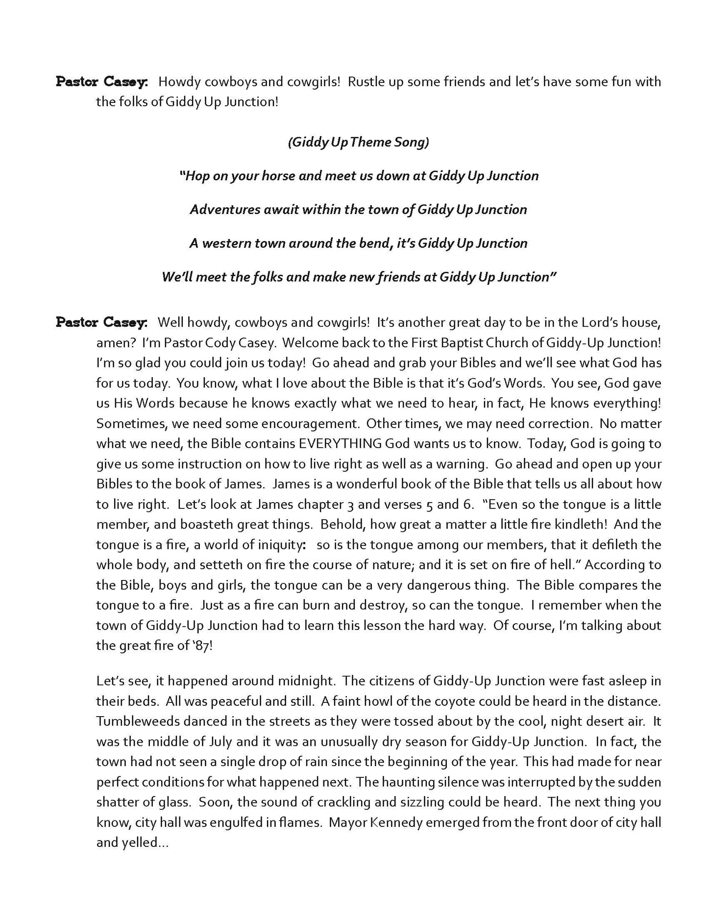 According to the Bible, the tongue can be a very dangerous thing. The Bible compares the tongue to a fire. Just as a fire can burn and destroy, so can the tongue. I remember when the town of GiddyUp Junction had to learn this lesson the hard way. Of course, I'm talking about the great fire of '87!