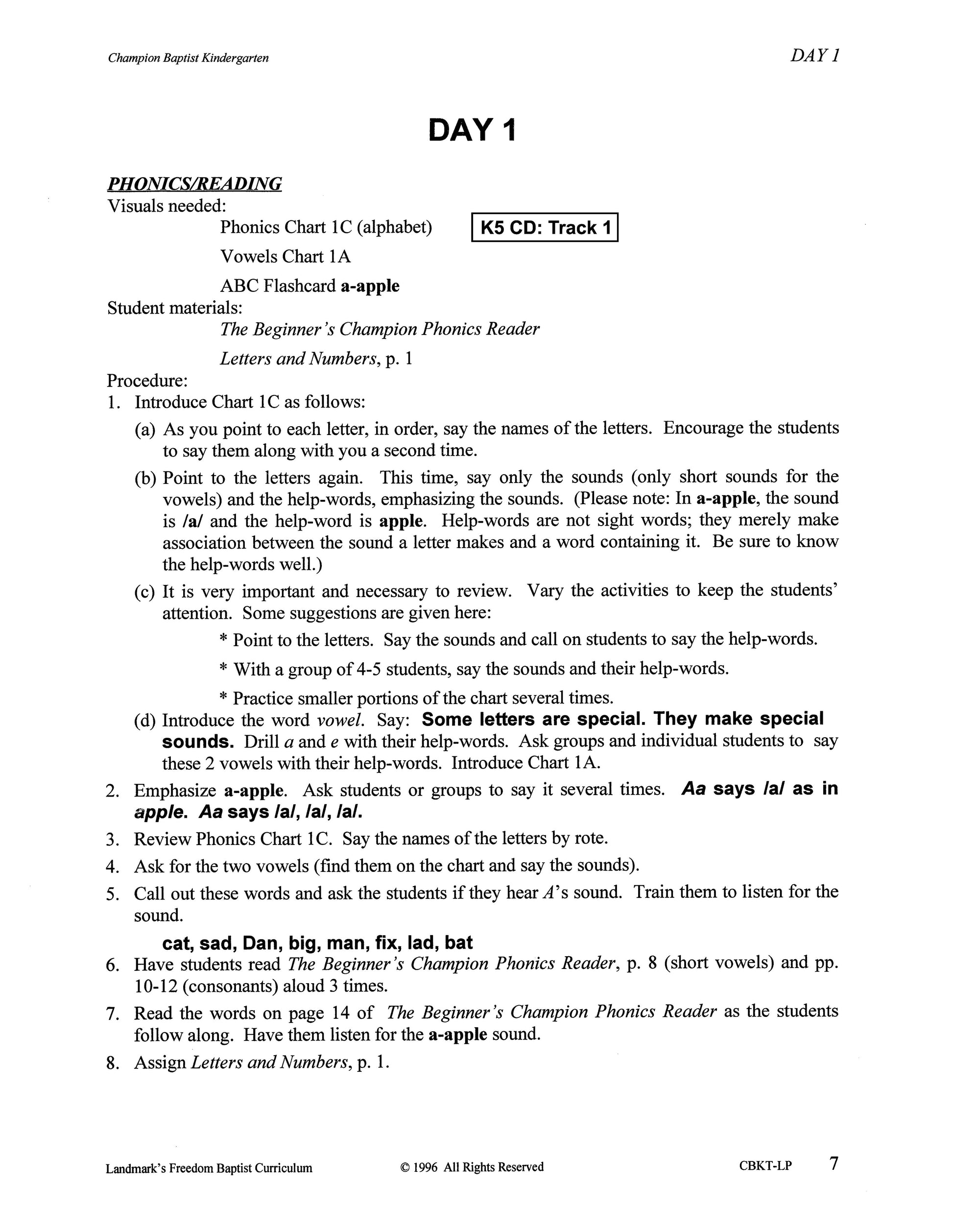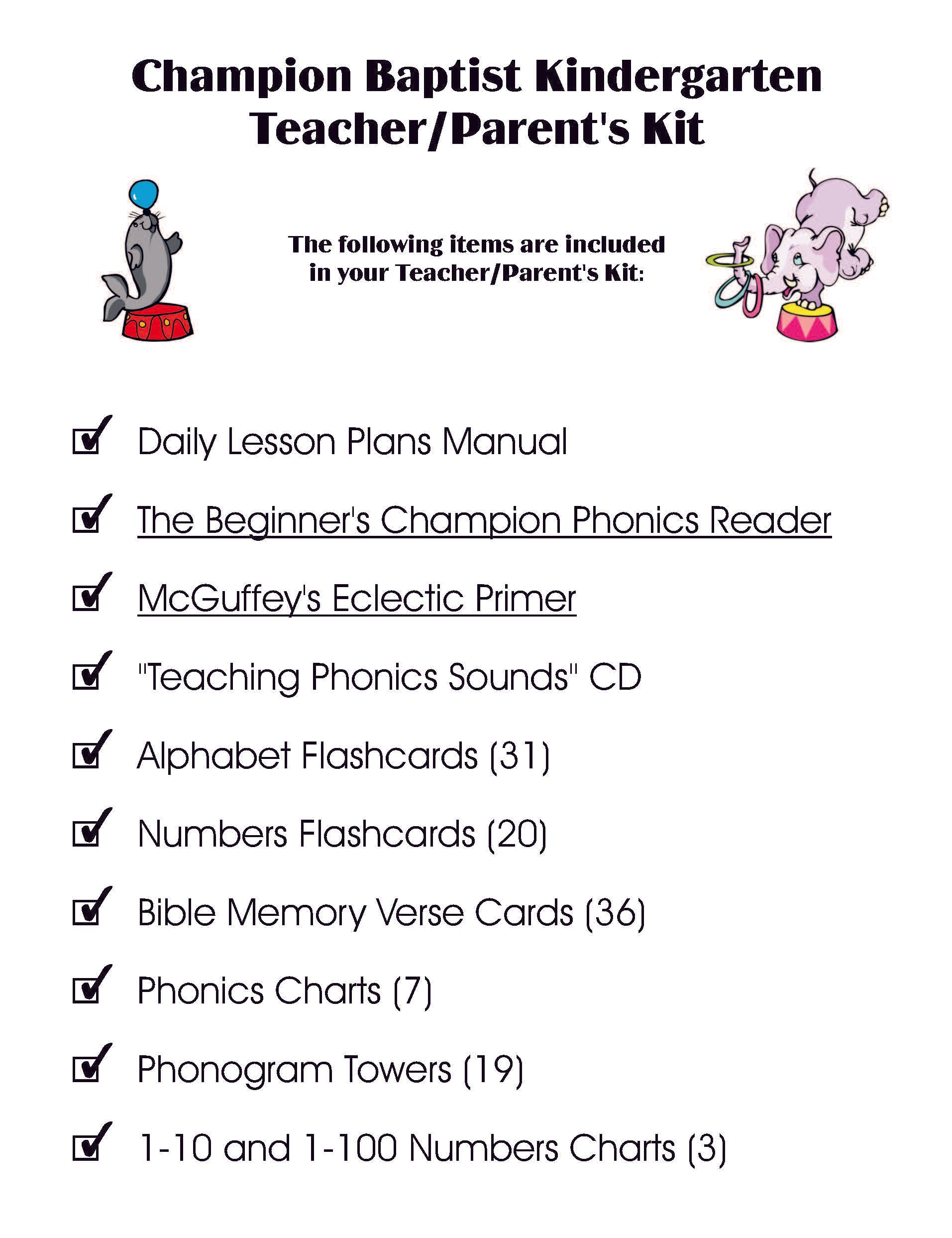 The Teacher's Kit can be reused from year to year. It is designed to be used with K5 Champion Baptist Kindergarten Student Kit. Comes with Daily Lesson Plans Manual, The Beginner's Champion Phonics Reader, McGuffey's Eclectic Primer, "Teaching Phonics Sounds" CD, 31 Alphabet Flashcards, 20 Numbers Flashcards, 36 Bible Memory Verse Cards, 7 Phonics Charts, 19 Phonogram Towers, and 1-10 and 1-100 Numbers Charts.