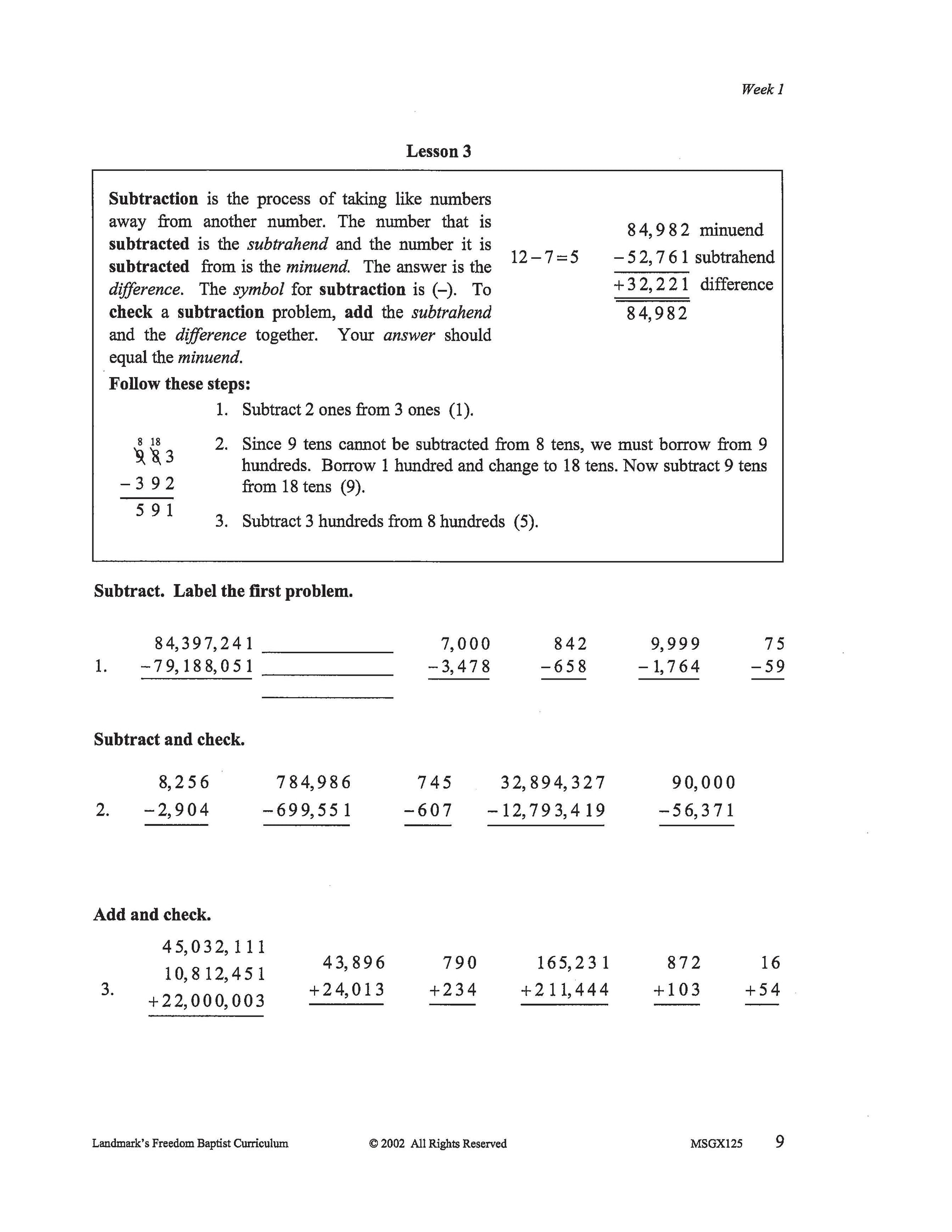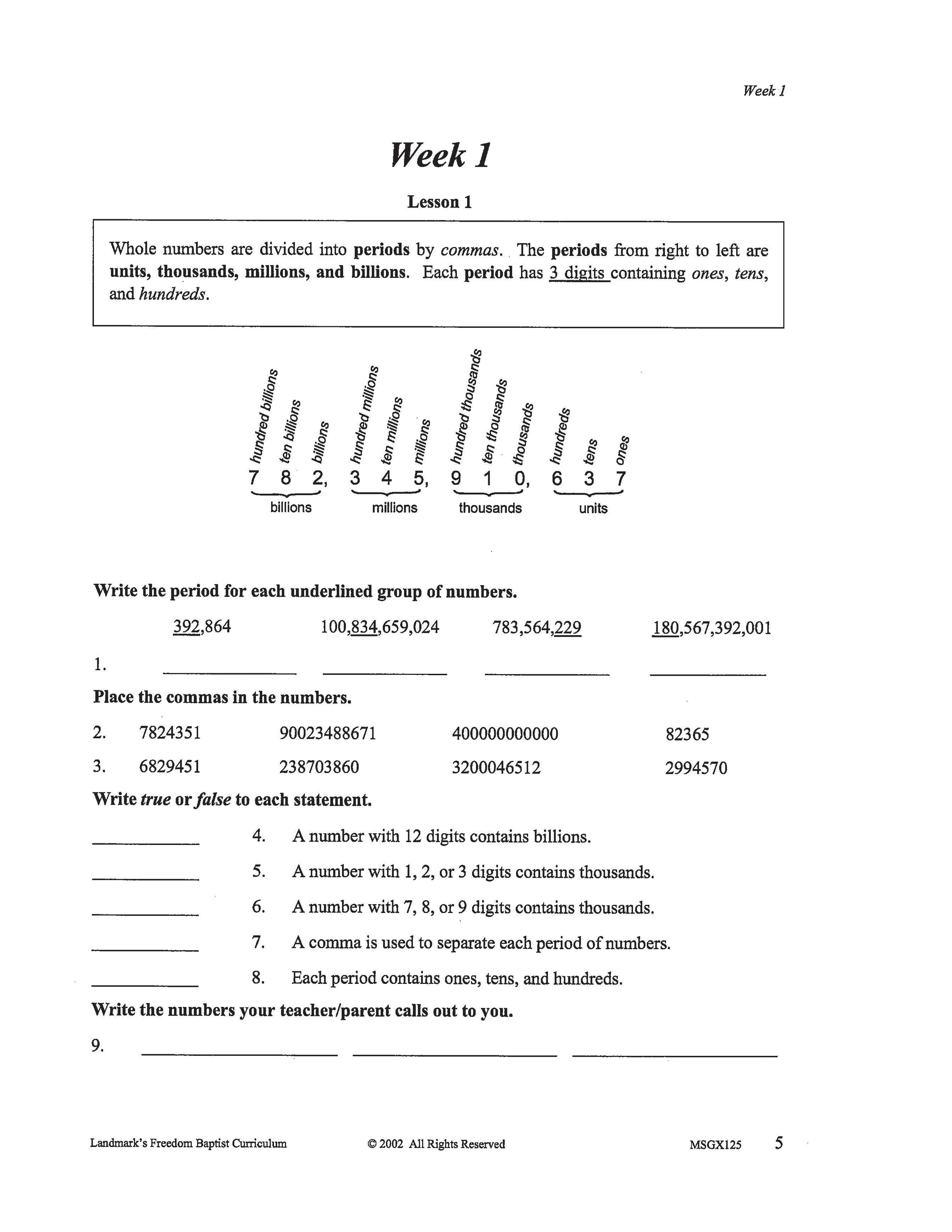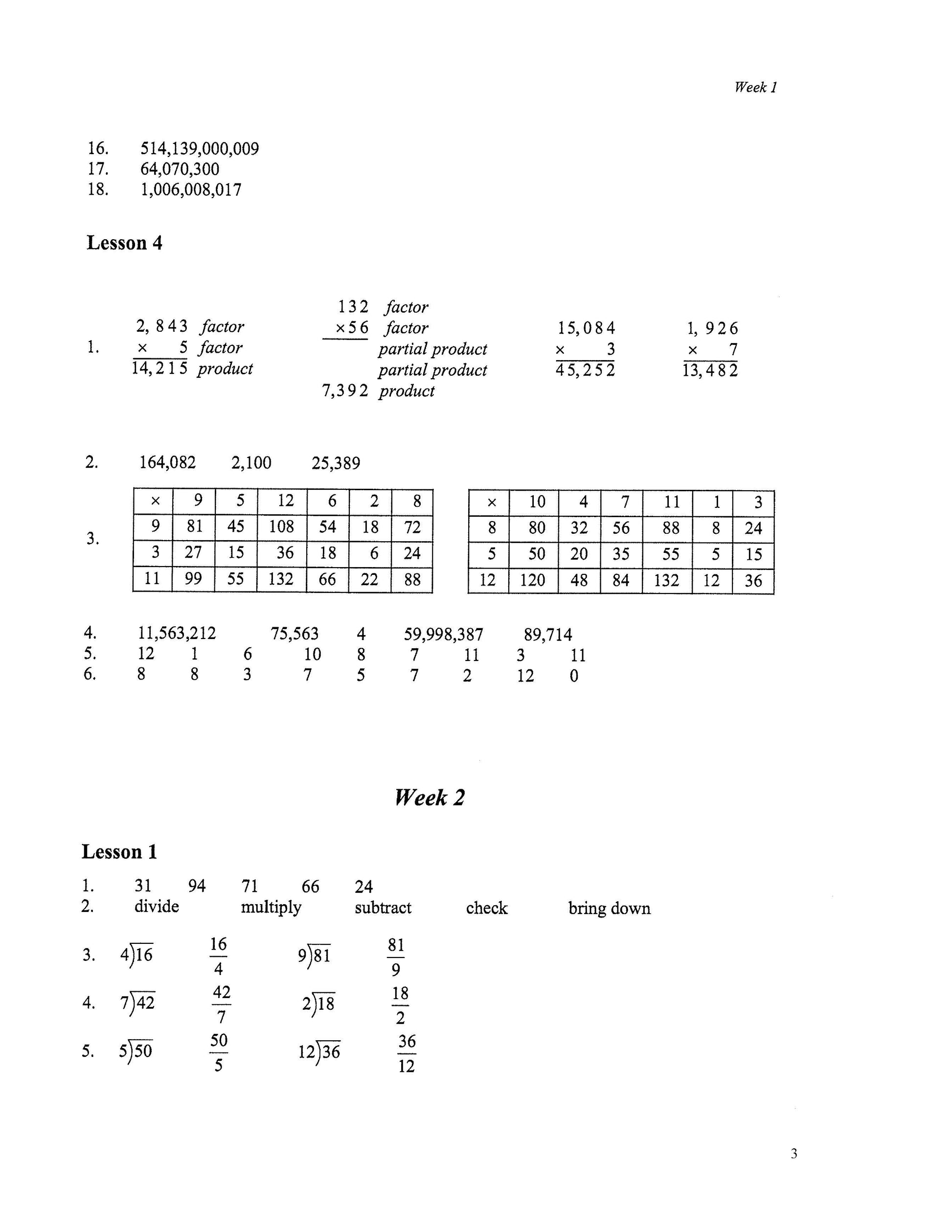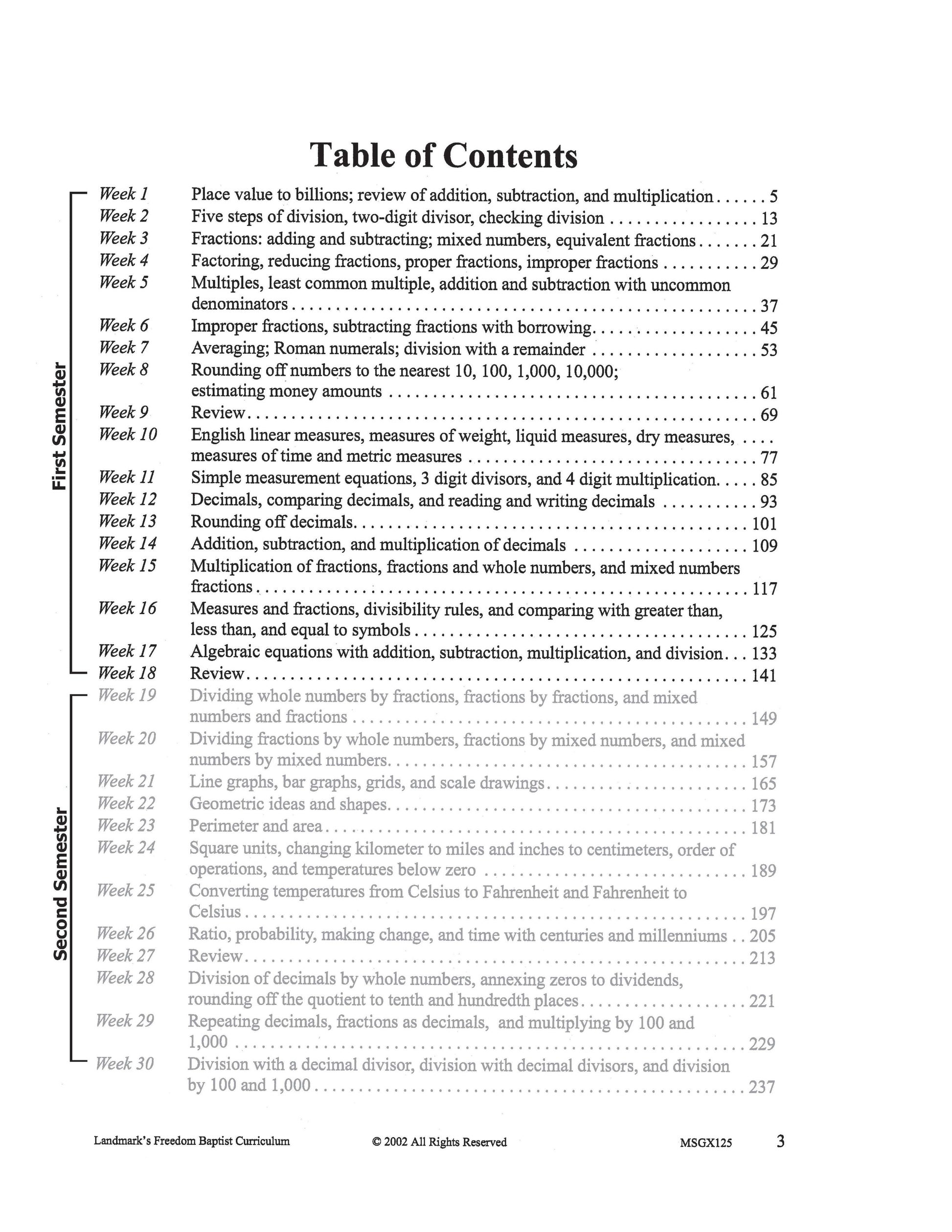 All basic concepts learned in previous grades are completely reviewed. Place value to billions; rounding off whole numbers, money, decimals, and mixed numbers; factoring; multiples; converting measures within the same system; perimeter and area; geometric ideas and shapes; line graphs, bar graphs, grids and scale drawings; measurement equations; algebraic equations with addition, subtraction, multiplication, and division; three-digit divisors; four-digit multiplication; division of decimals; fractions as decimals; introduction to percent, decimals with percent, percent as fractions, and word problems are presented in understandable ways. Each complete subject set includes everything you need for one student for one year. Because the set is complete, you are assured that Study Guides, Study Guide Answers, Test and Quizzes, and Test and Quiz Answers are included and are the latest edition available.