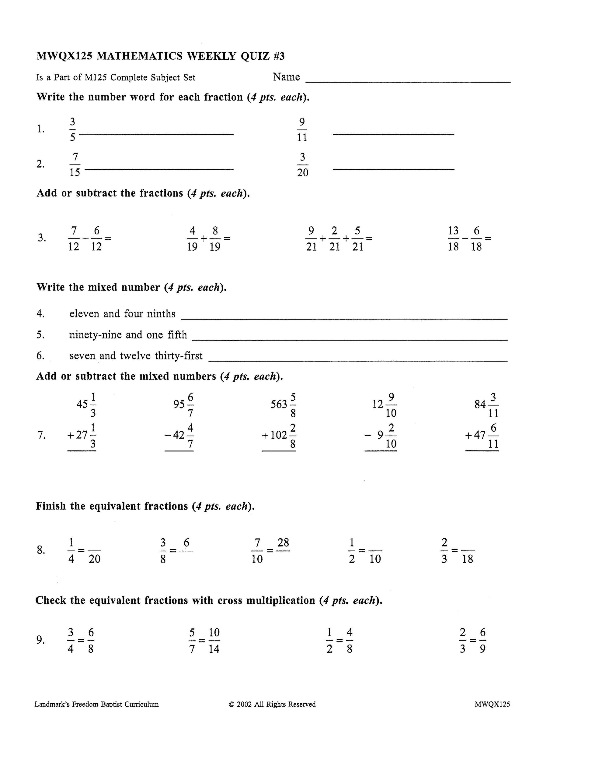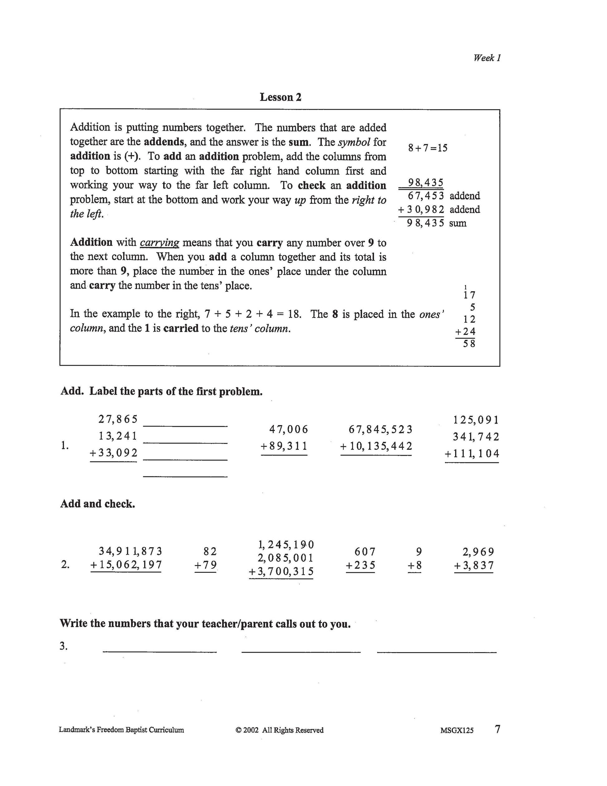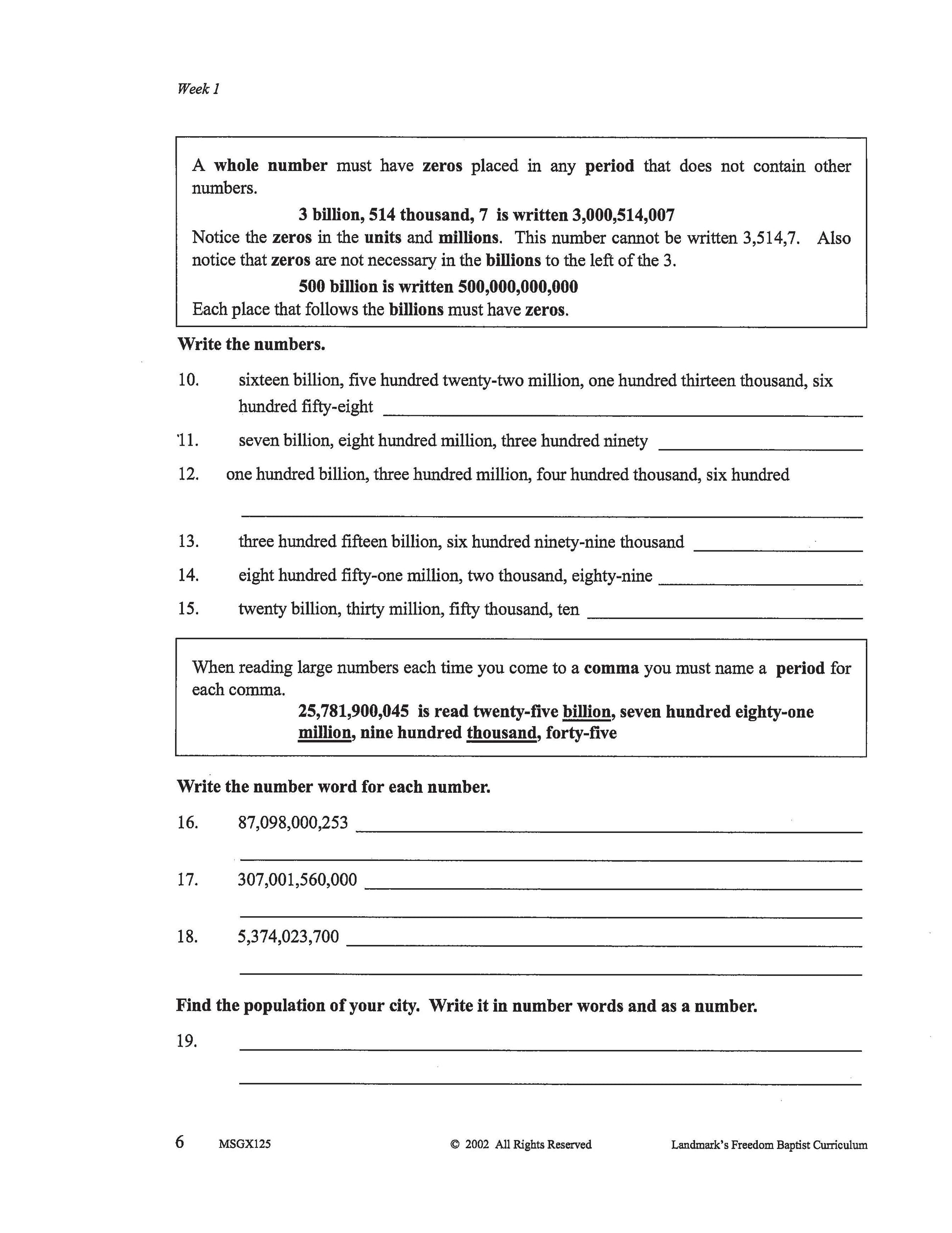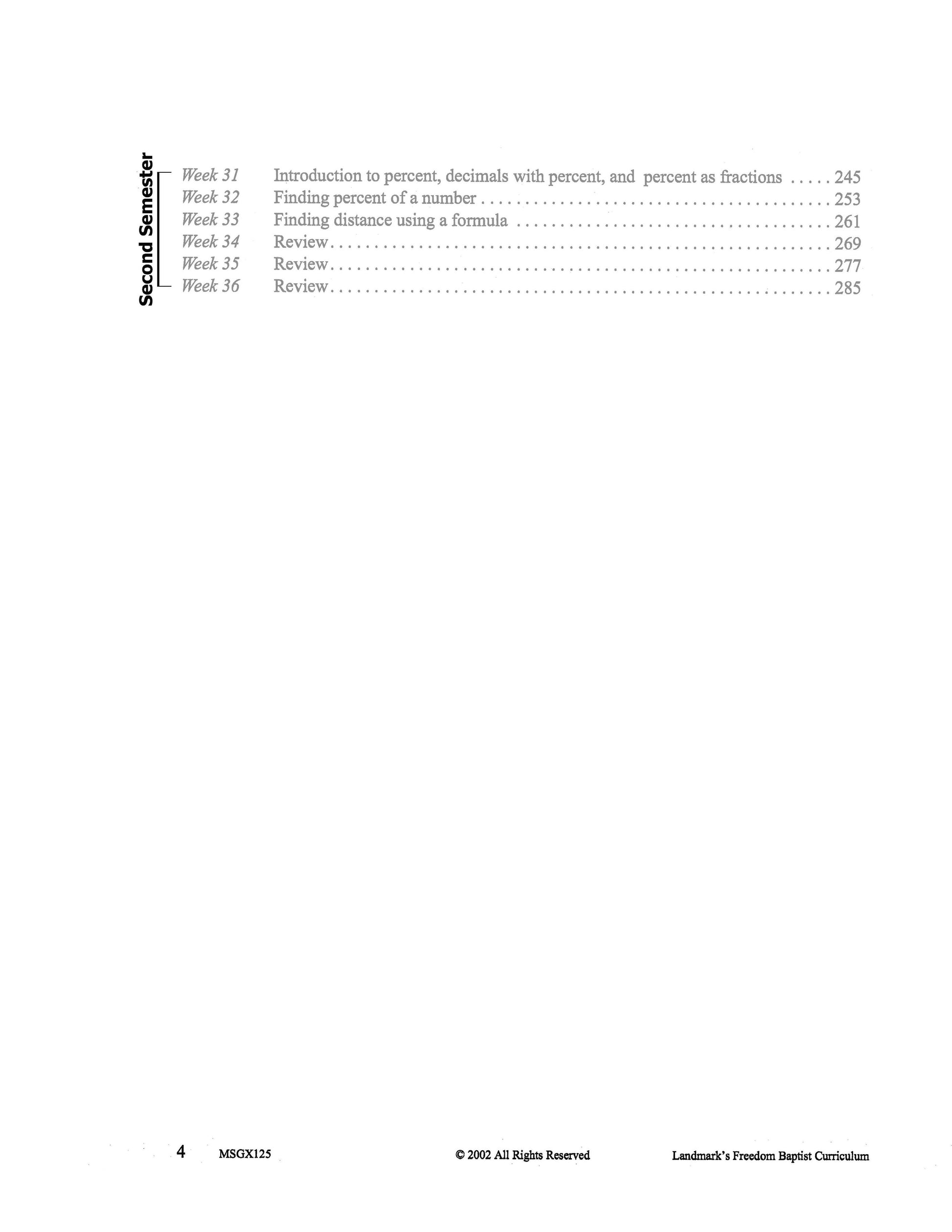 All basic concepts learned in previous grades are completely reviewed. Place value to billions; rounding off whole numbers, money, decimals, and mixed numbers; factoring; multiples; converting measures within the same system; perimeter and area; geometric ideas and shapes; line graphs, bar graphs, grids and scale drawings; measurement equations; algebraic equations with addition, subtraction, multiplication, and division; three-digit divisors; four-digit multiplication; division of decimals; fractions as decimals; introduction to percent, decimals with percent, percent as fractions, and word problems are presented in understandable ways. Each complete subject set includes everything you need for one student for one year. Because the set is complete, you are assured that Study Guides, Study Guide Answers, Test and Quizzes, and Test and Quiz Answers are included and are the latest edition available.