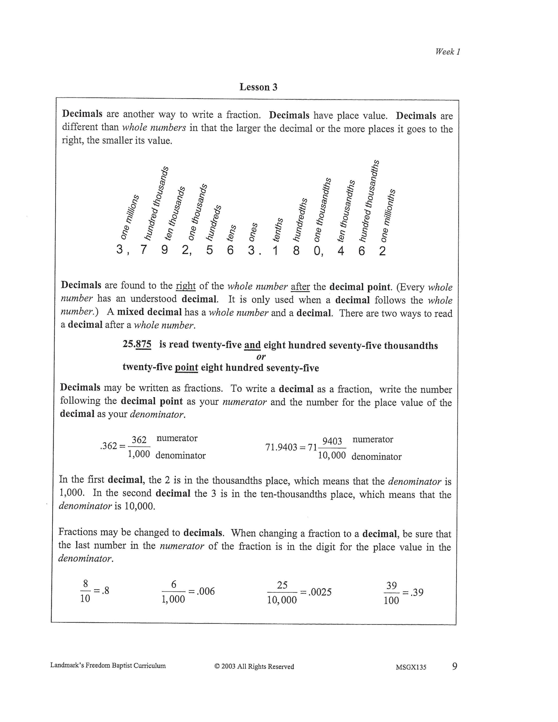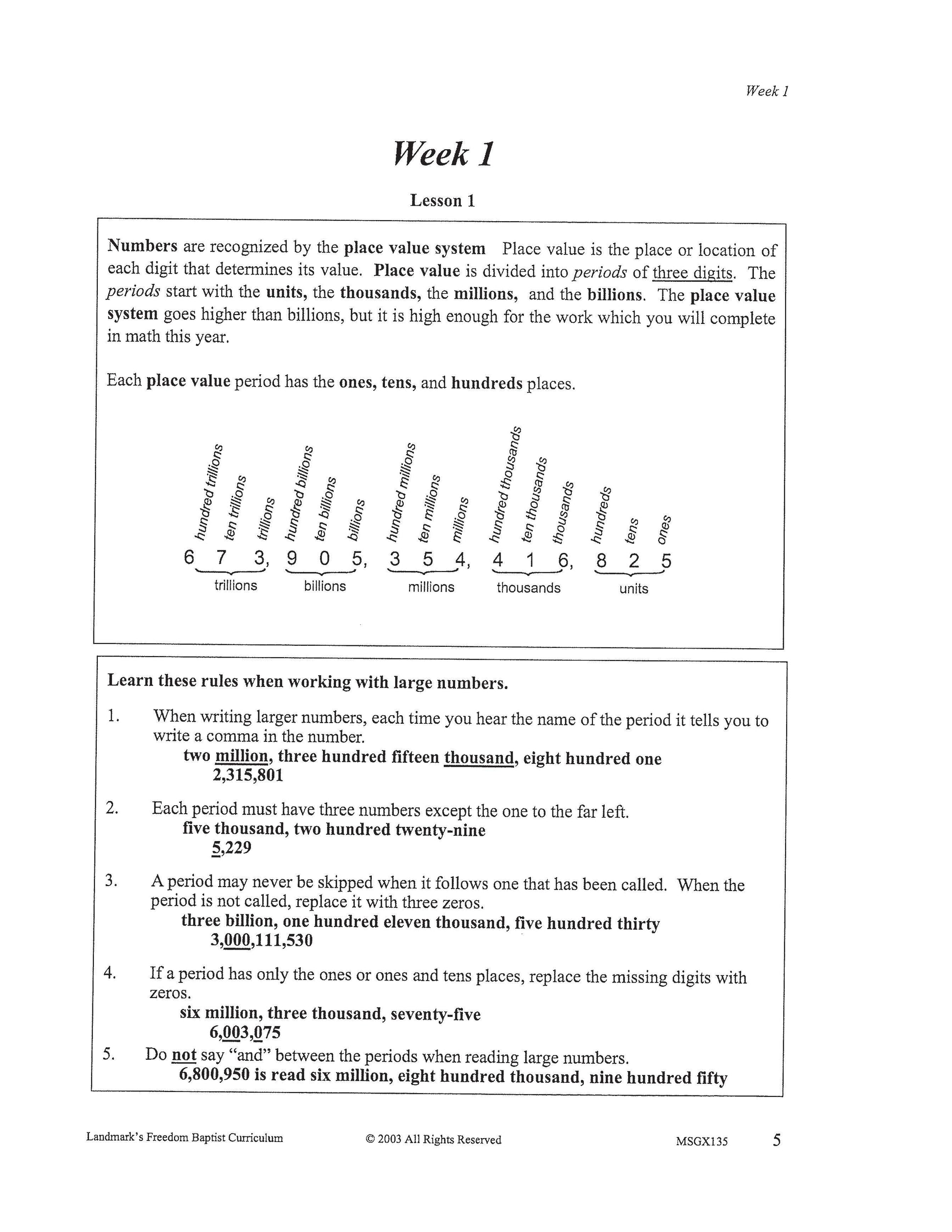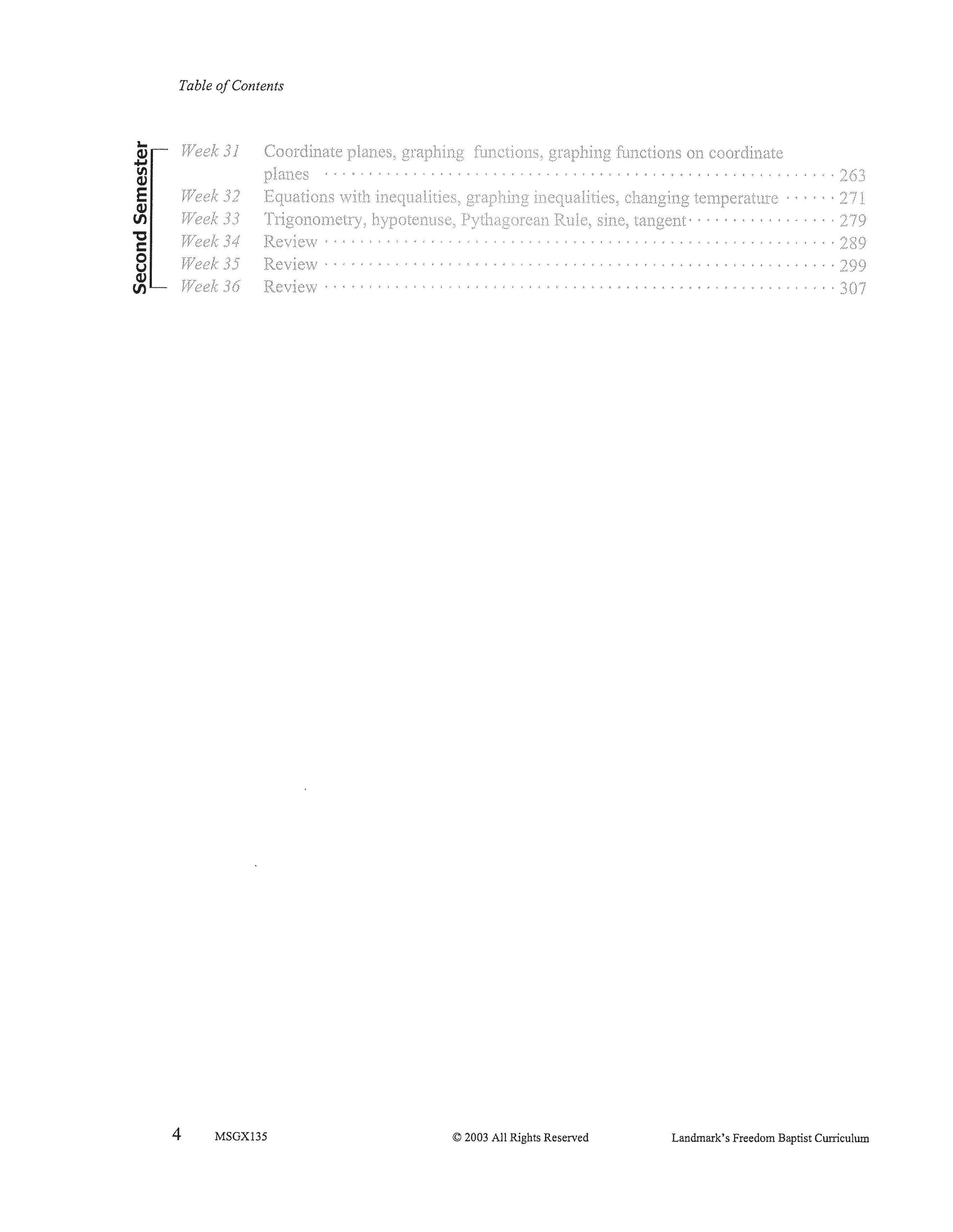 Students review and build on concepts learned. Place value of whole numbers, rounding off; review of fundamental skills in addition, subtraction, multiplication, division, fractions, and decimals; English and metric measures, converting measures; percents: changing percents to fractions and fractions to percents; changing percents to decimals and decimals to percents; finding percent of a number; perimeter, area, circumference. Each complete subject set includes everything you need for one student for one year. Because the set is complete, you are assured that Study Guides, Study Guide Answers, Test and Quizzes, and Test and Quiz Answers are included and are the latest edition available.