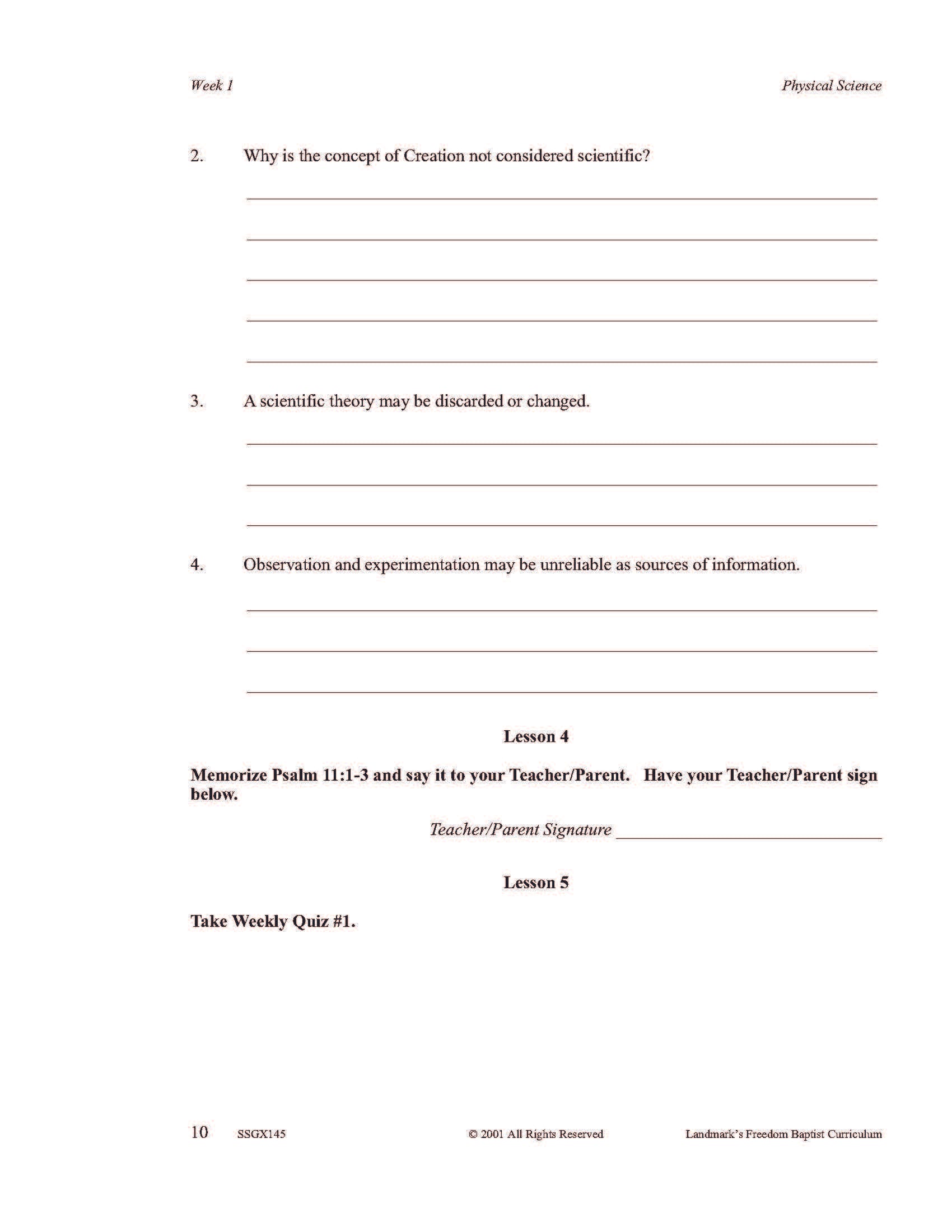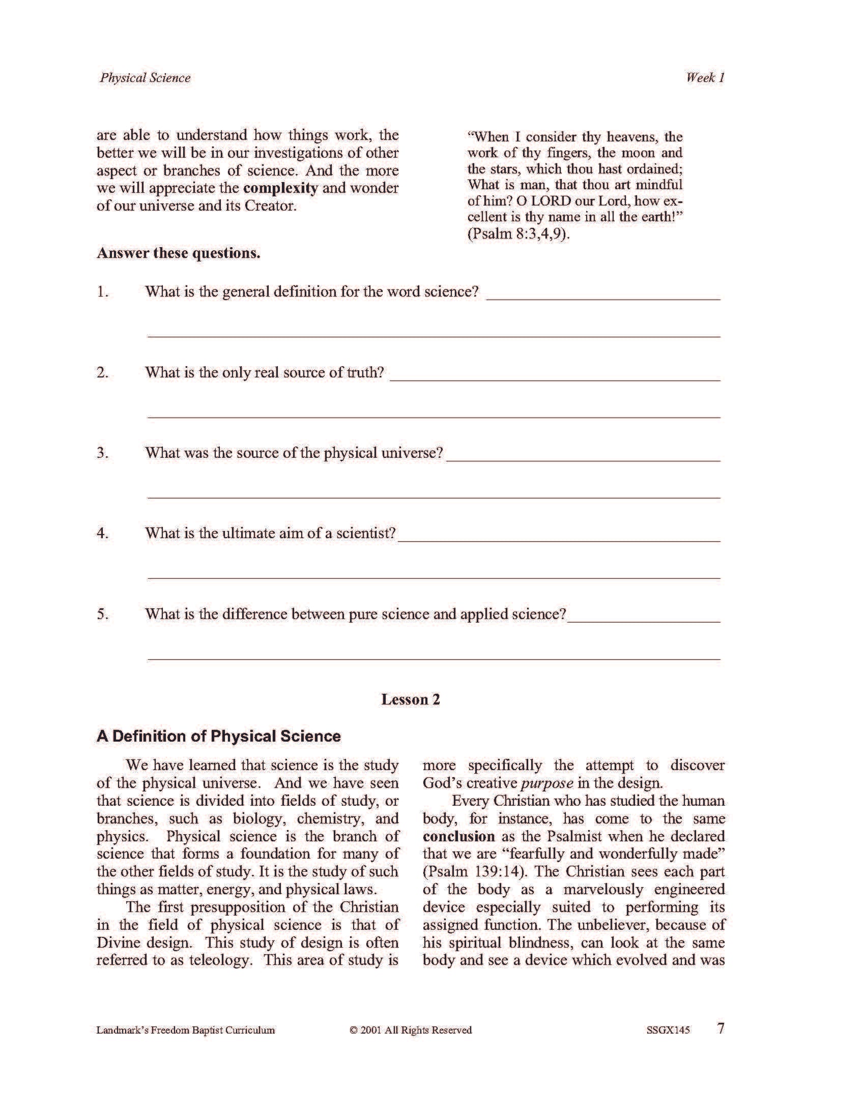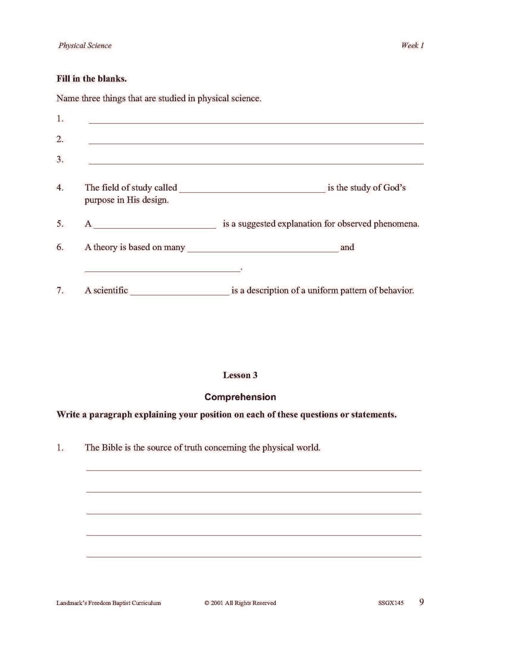 It covers the scientific method, physical forces such as gravity and centrifugal force, basic chemical properties of matter, sound, light, heat, and other forms of energy. Each complete subject set includes everything you need for one student for one year. Because the set is complete, you are assured that Study Guides, Study Guide Answers, Test and Quizzes, and Test and Quiz Answers are included and are the latest edition available.