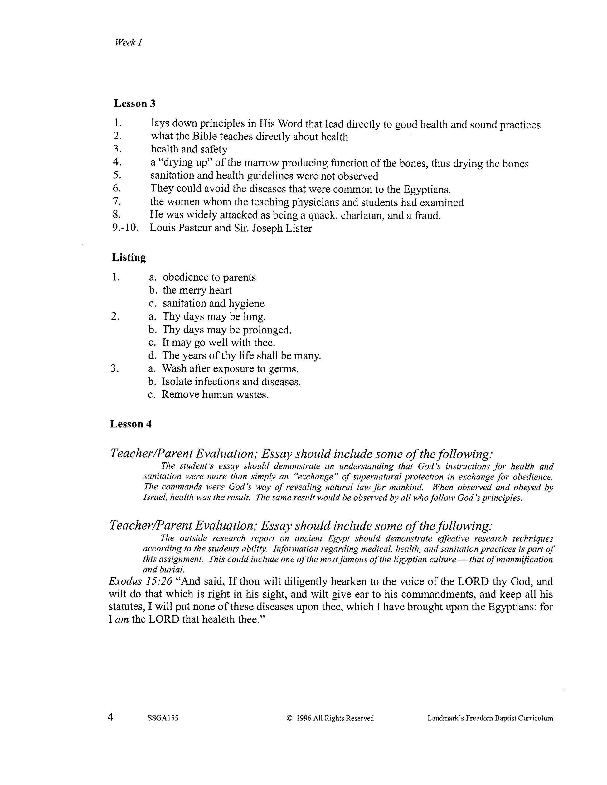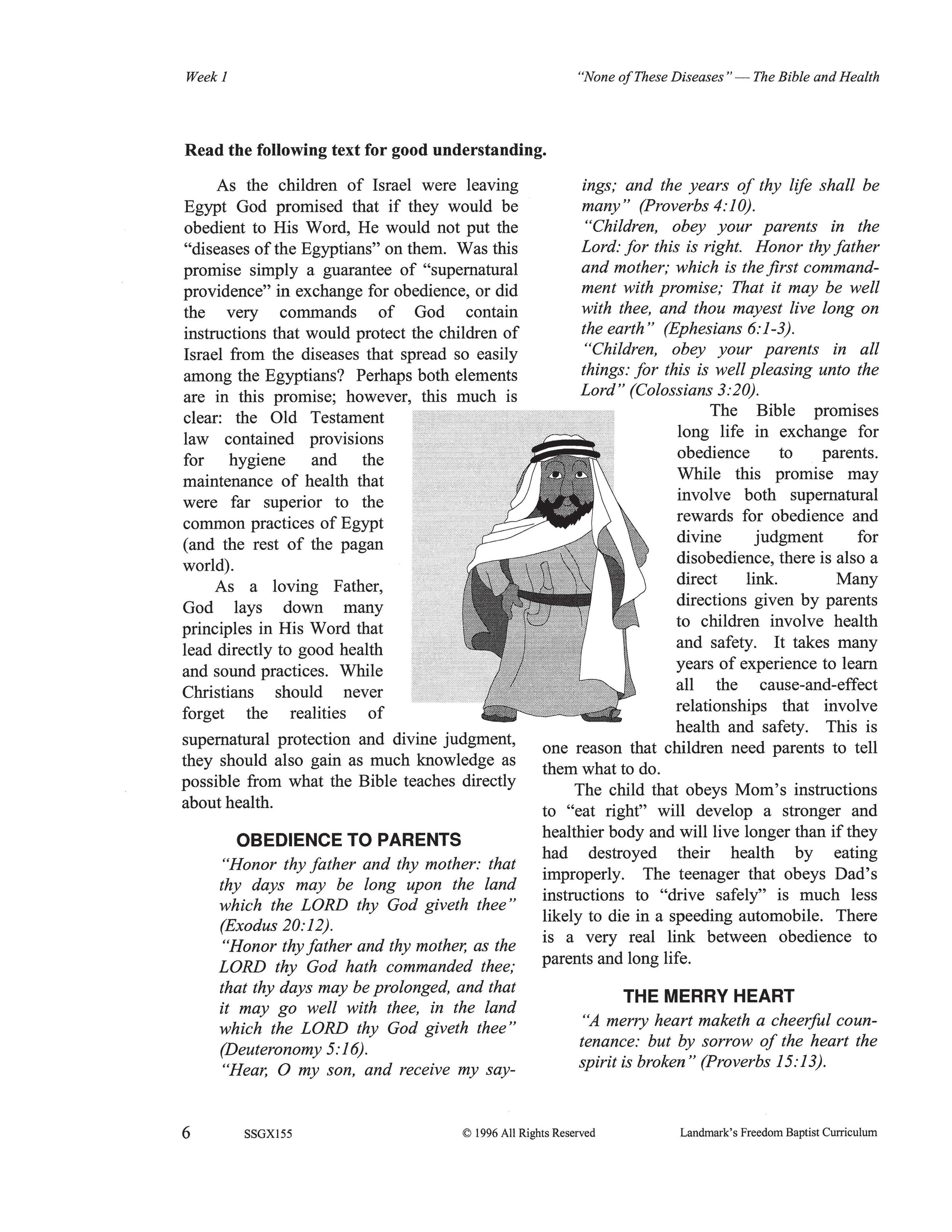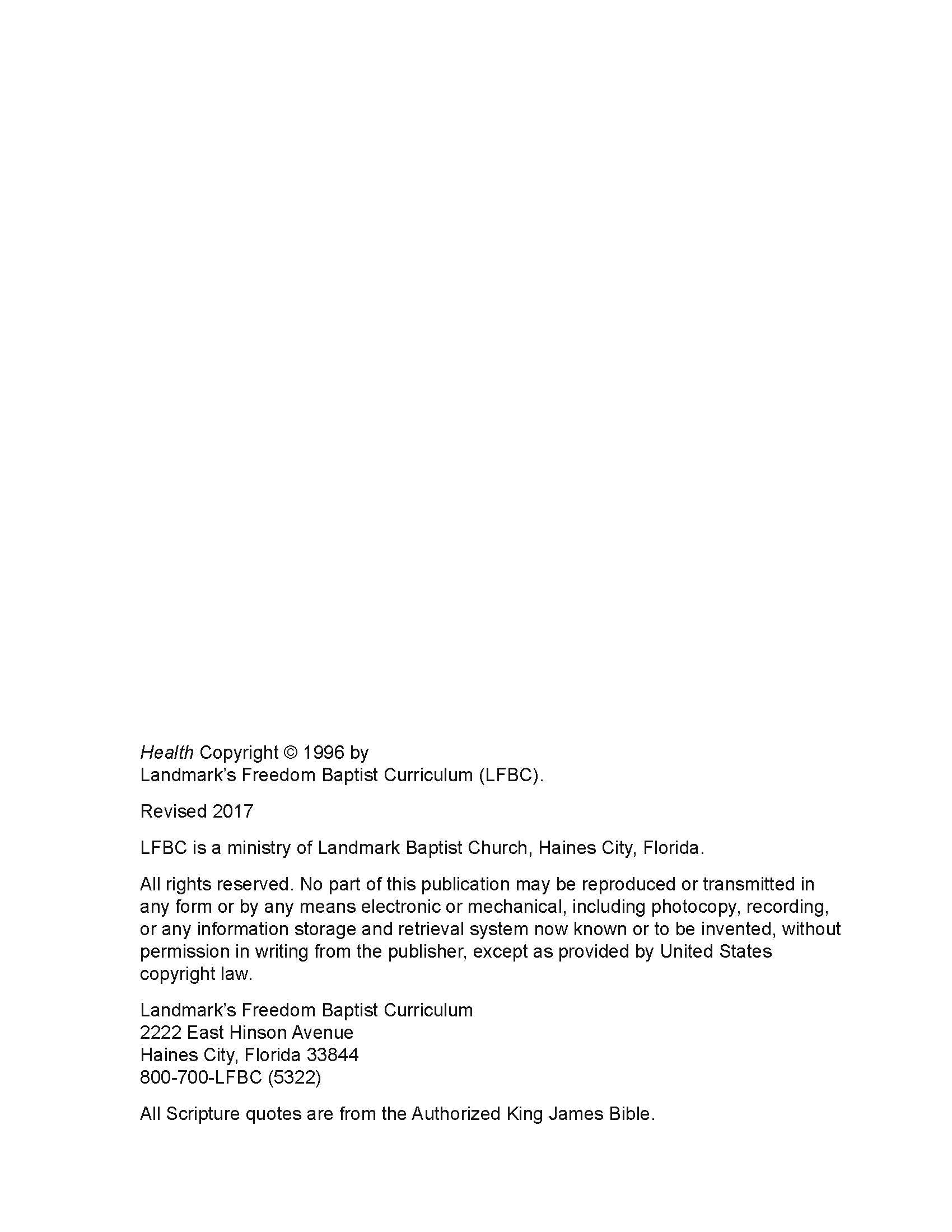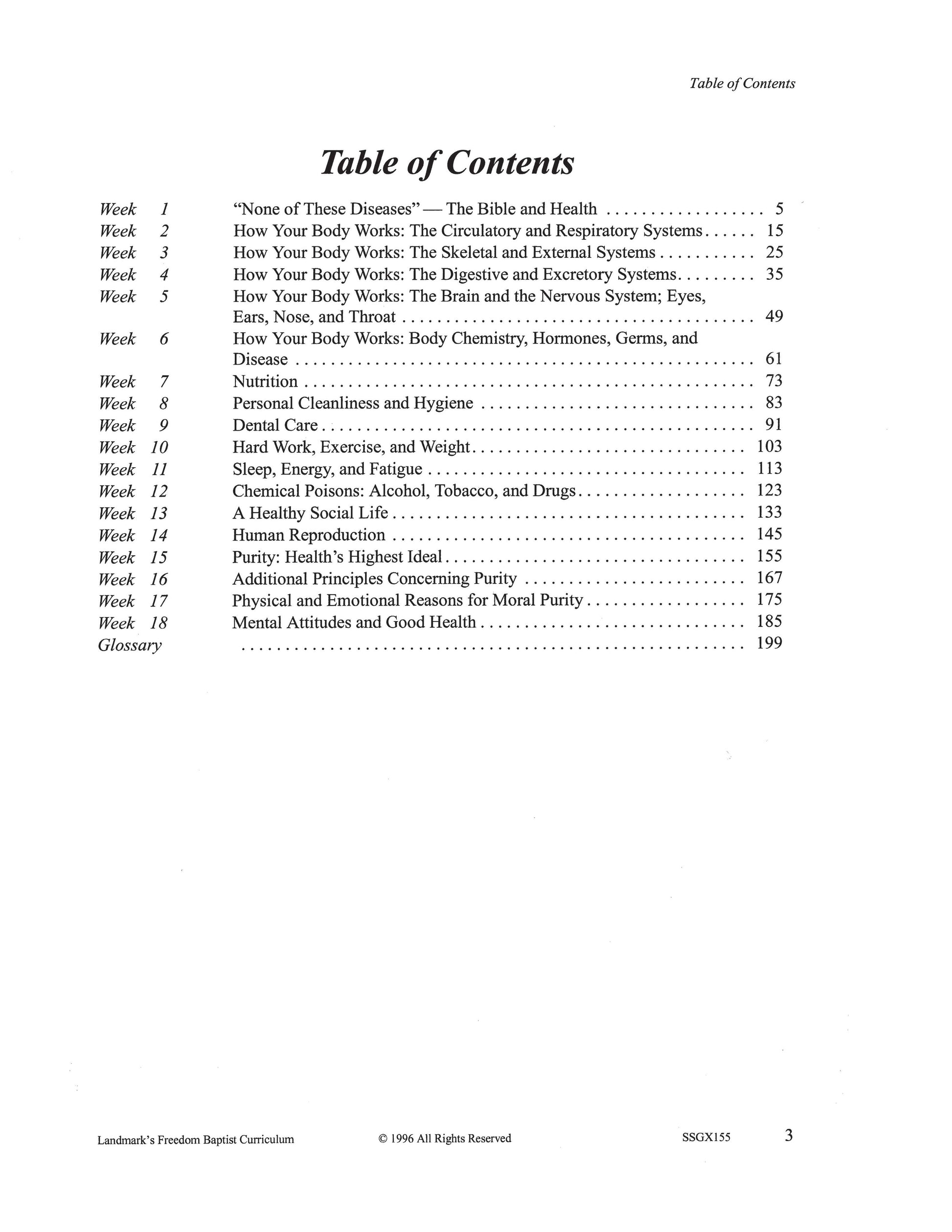 Health (S155) - This one semester course includes very practical presentations of the human body. Special emphasis is given to the importance of moral purity, including a study of God’s moral code as found in the Scriptures. This strongly Bible-based material has been preached and taught to young people with tremendous success for several years by a fundamental Baptist preacher.