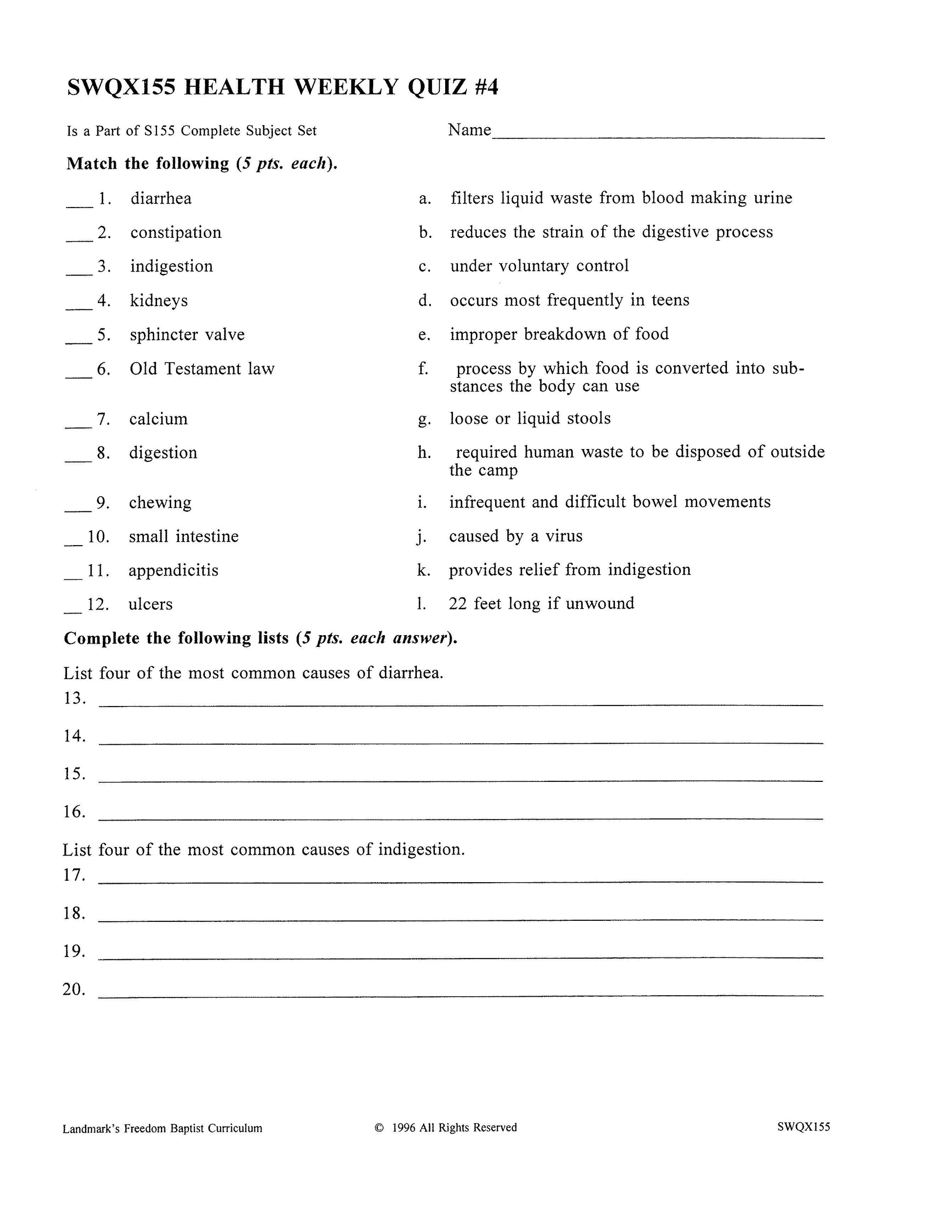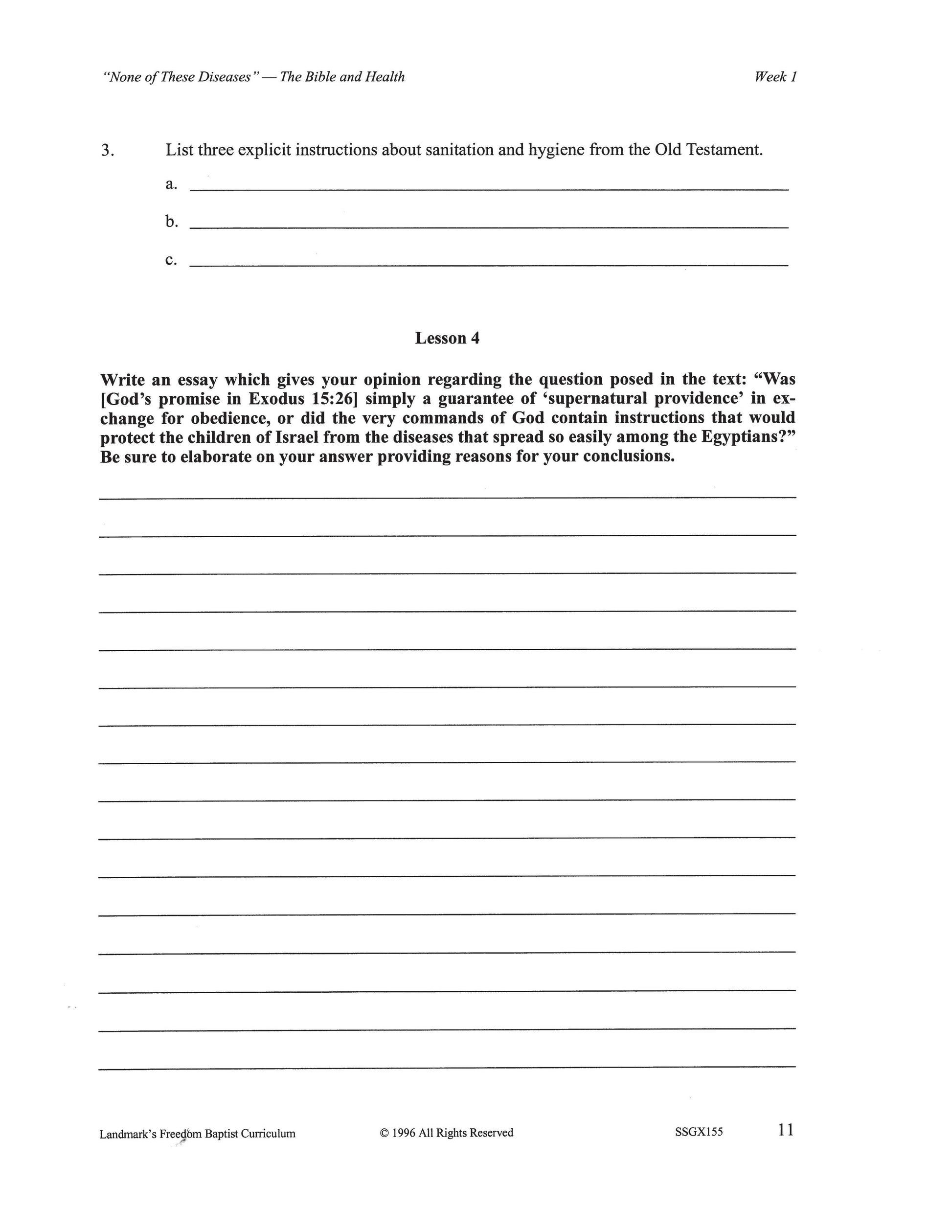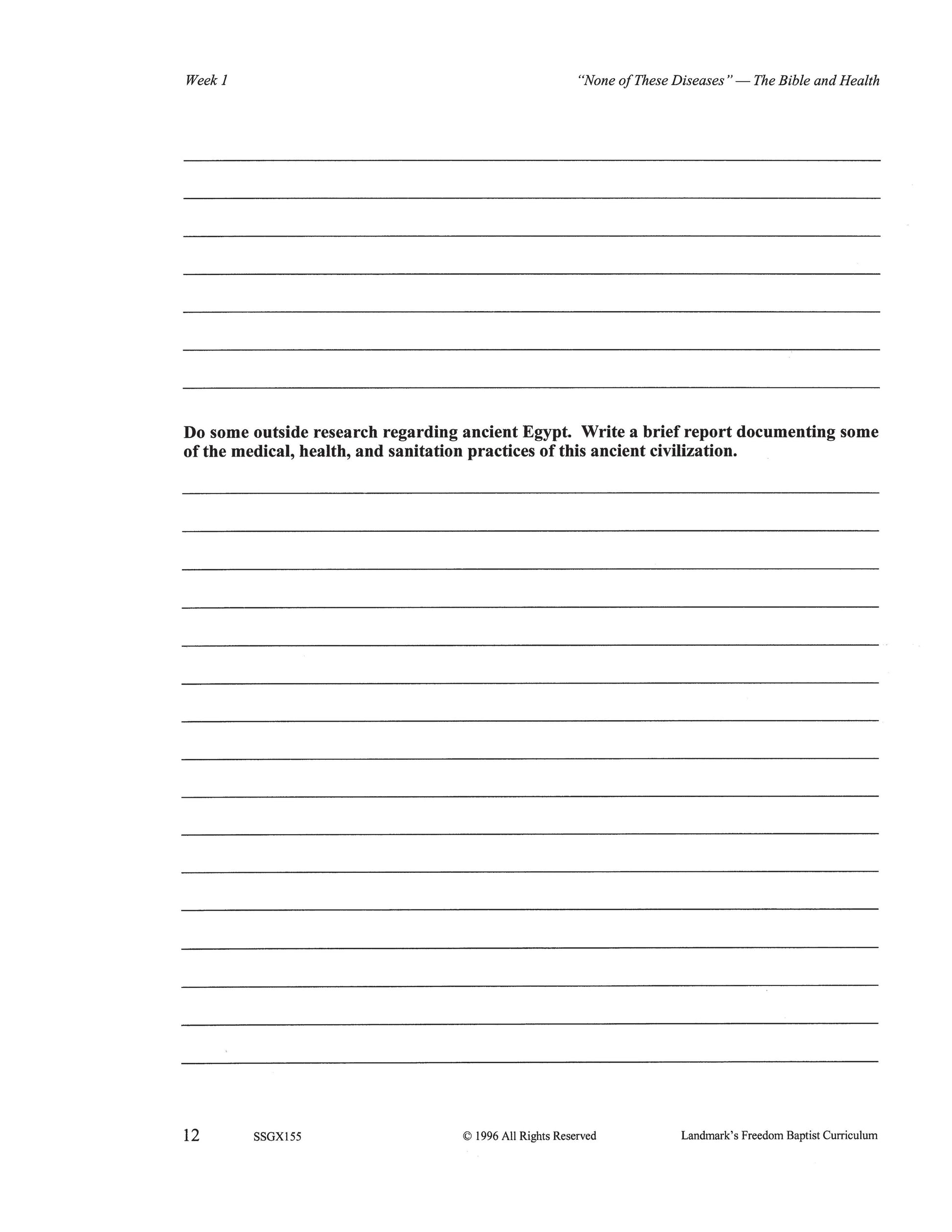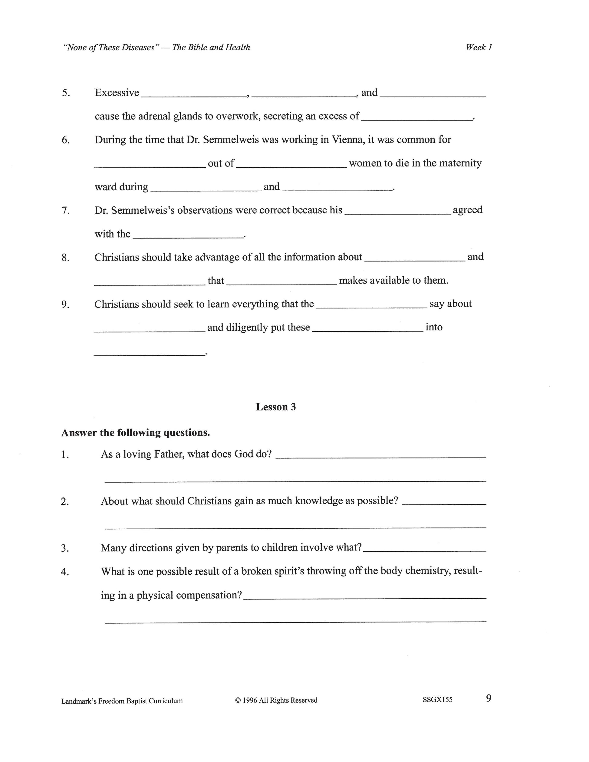 Health (S155) - This one semester course includes very practical presentations of the human body. Special emphasis is given to the importance of moral purity, including a study of God’s moral code as found in the Scriptures. This strongly Bible-based material has been preached and taught to young people with tremendous success for several years by a fundamental Baptist preacher.