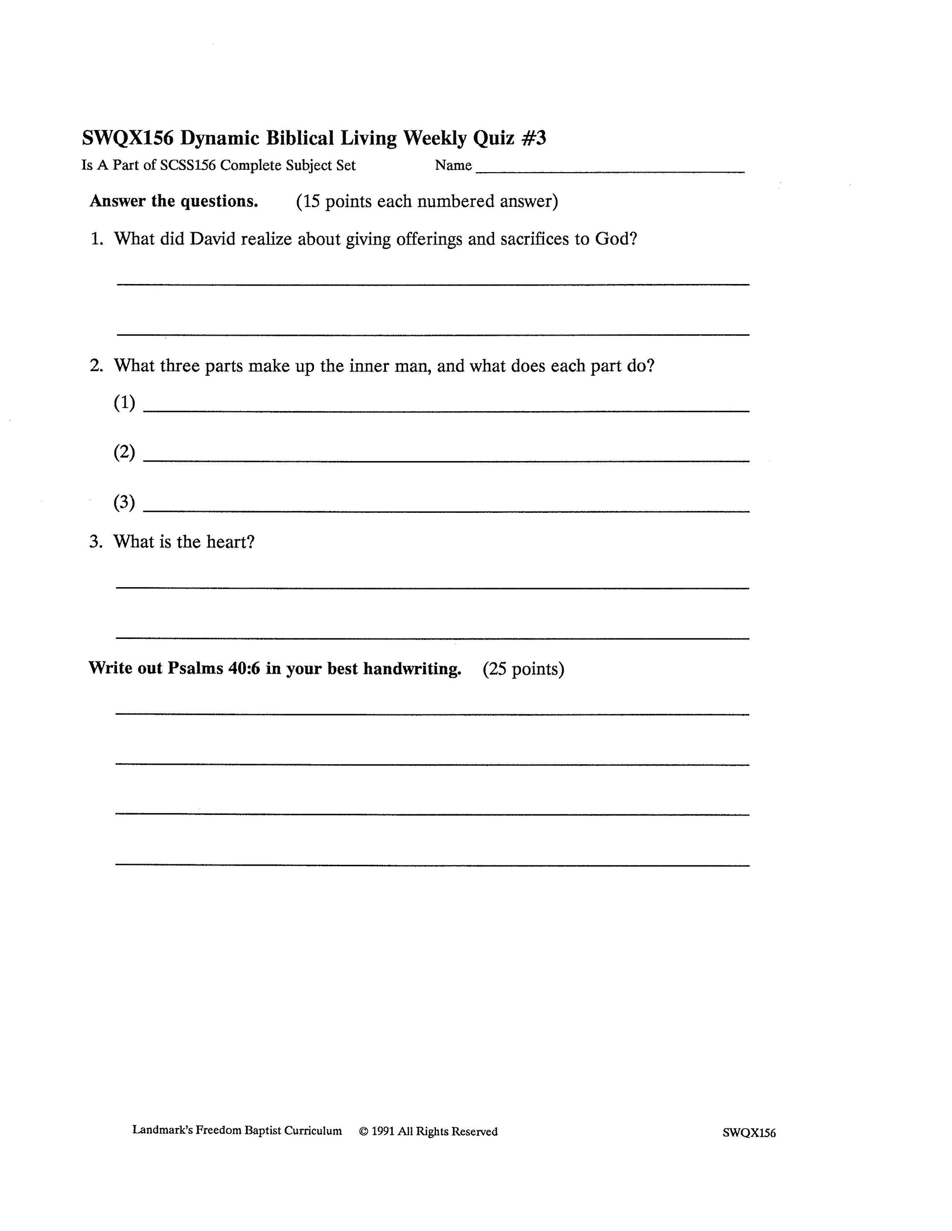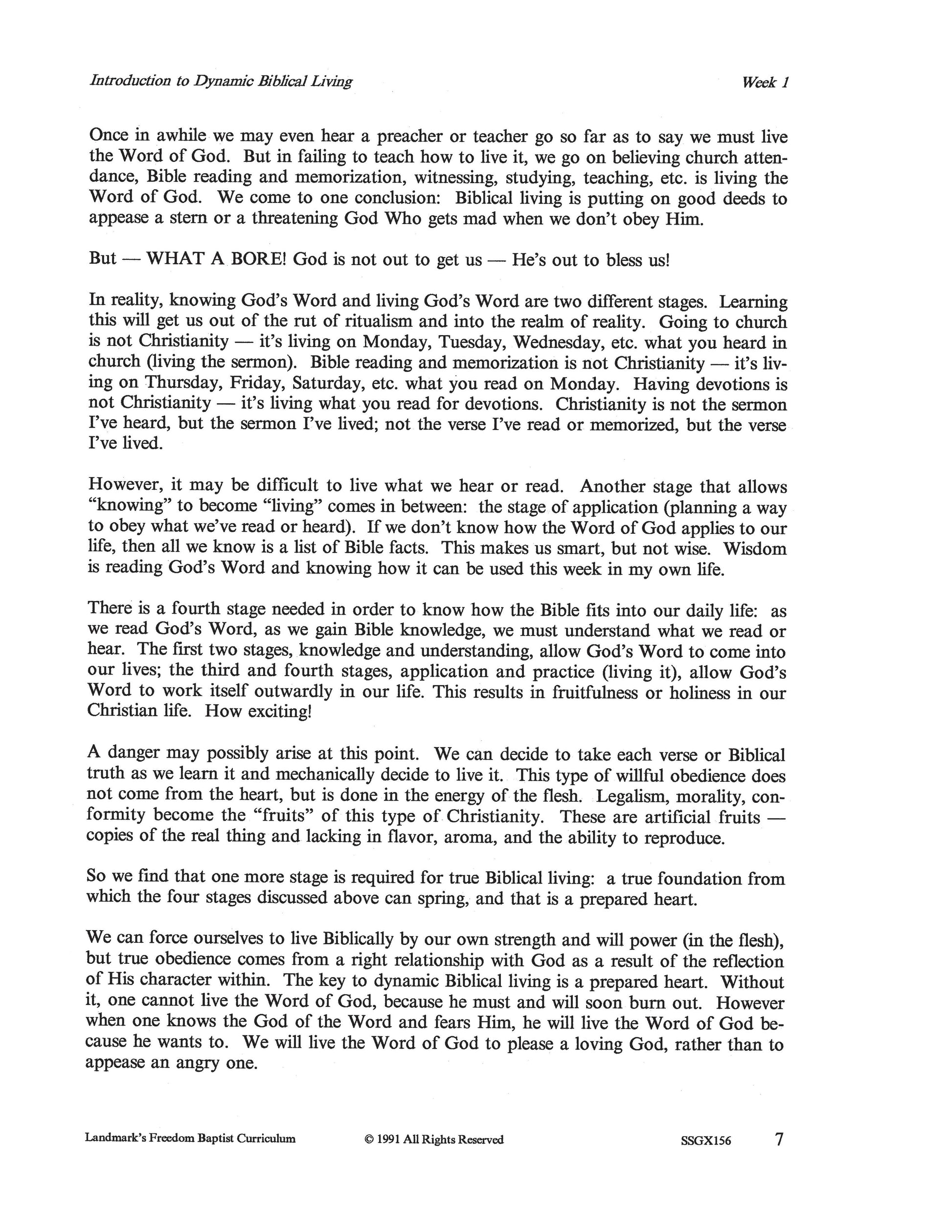 Dynamic Biblical Living (S156) - This Scripture-based course deals with issues vital to enabling our Christian young people to develop into solid and mature Bible-knowing and God-loving Christians. The course deals with preparing one’s heart and mind for gleaning truths from the Word of God. Then, it progressively teaches how to correctly interpret Scripture and to practically apply its teachings to our lives. This is a one semester course.